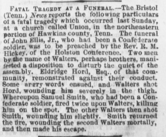ssembly. Eldridge Hord, Esq., ot that community, remonstrated against their conduct, some angry words ensued, and Walters shot Hord, wounding him severely in the thigh.